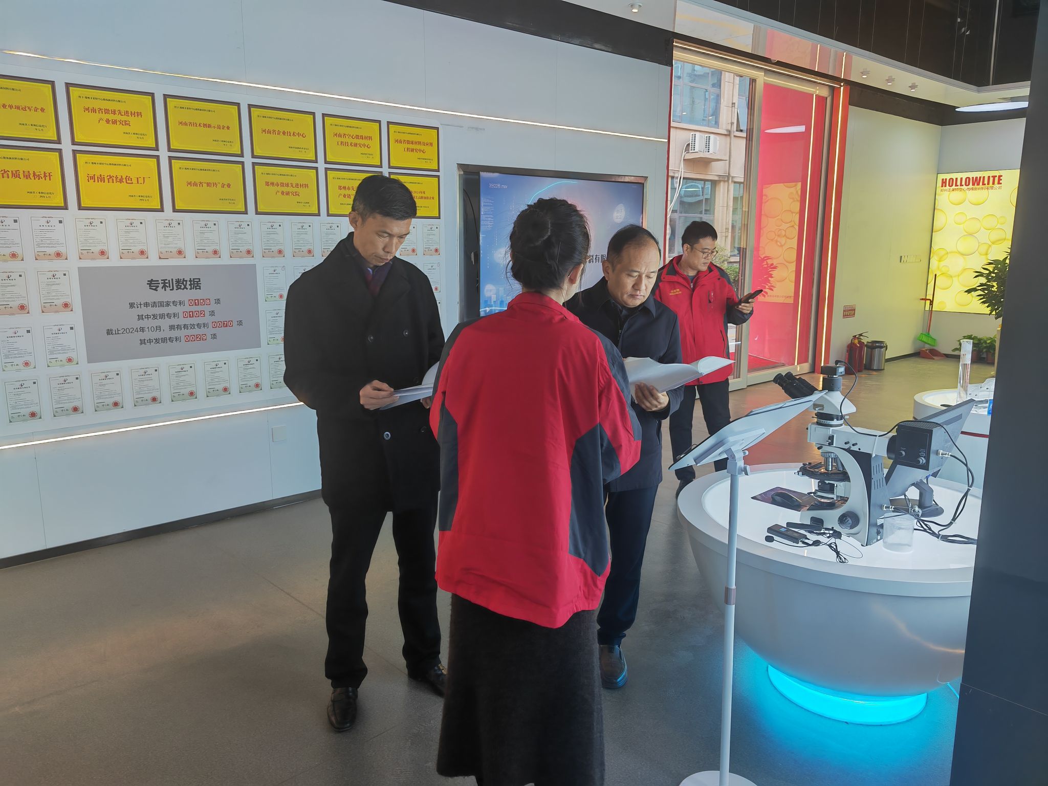 在许卫涛的陪同下,杨磊一行参观了公司产品展示中心,观看了圣莱特宣传视频,深入了解空心玻璃微珠作为功能性前沿新材料,在纺织印刷、航空航天、军事海洋、电子信息、新能源汽车、节能减碳和油气田开发等领域的广泛应用。