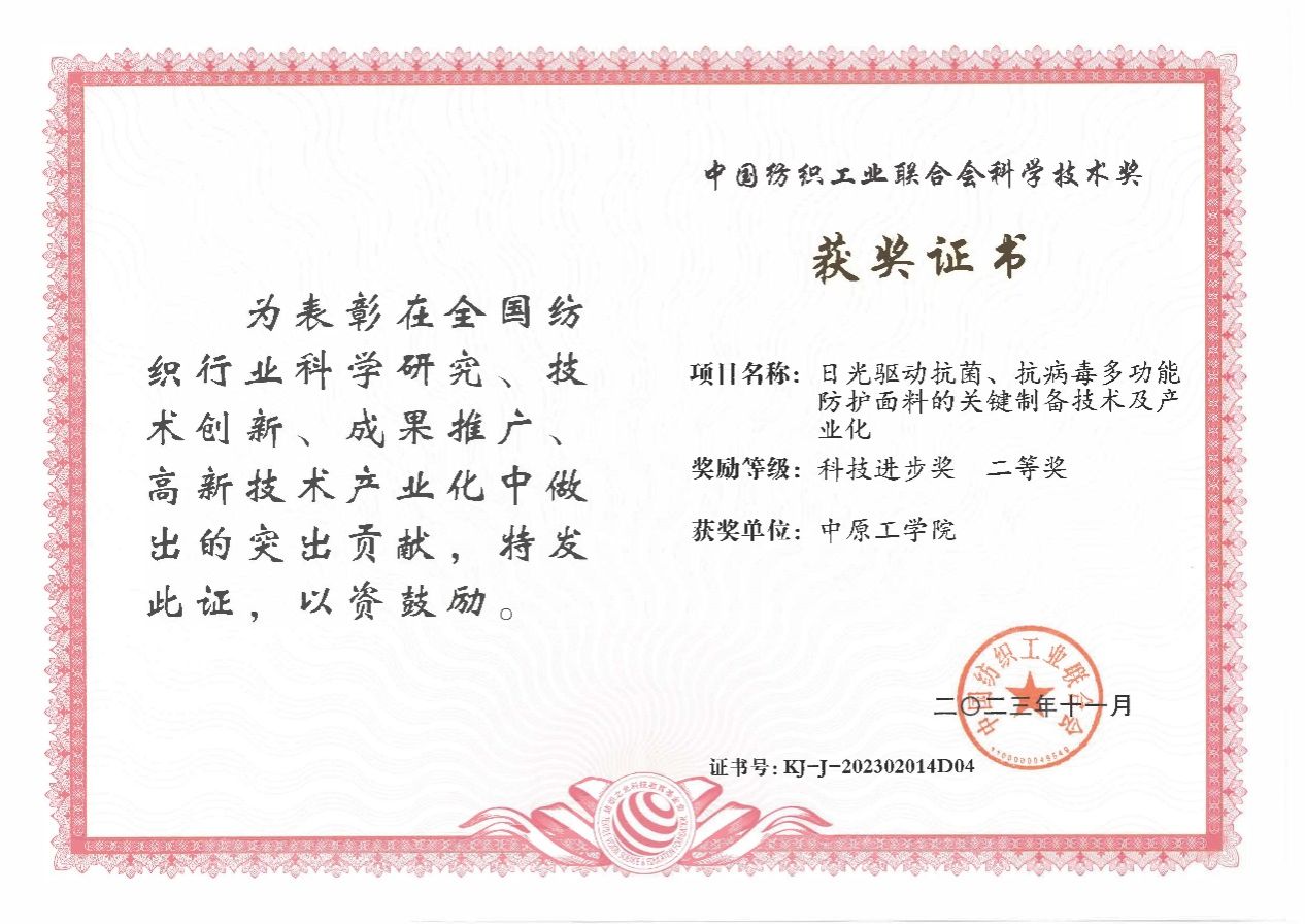 公司张恒老师的项目“日光驱动抗菌、抗病毒多功能防护面料的关键制备技术及产业化”荣获2023年度中国纺织工业联合会科学技术进步奖二等奖。