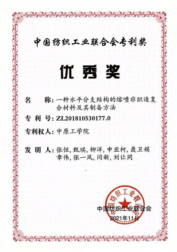 公司张恒老师主持的项目“一种水平分支结构的熔喷非织造复合材料及其制备方法”荣获中国纺织工业联合会专利奖优秀奖