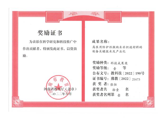 公司张恒老师主持的项目“高医用防护性微纳米非织造材料的制备关键技术及产业化” 荣获2022年河南省教育厅科技成果奖一等奖。