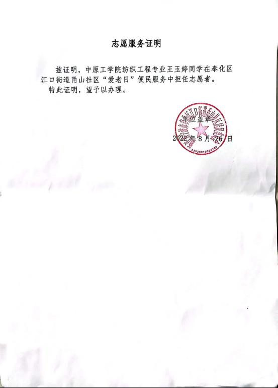 王玉婷,女,365在线体育投注官网365在线体育投注官网纺织工程203班班长,2020-2021学年获得学业二等奖学金,在2022年夏天,王玉婷同学用自己的热情给家乡敬老院的老人送去了温暖,同时深切体会了志愿服务的意义。她热情、有耐心、负责的精神得到了活动负责人的高度赞扬,在之后的活动中,王玉婷同学也必将传承志愿精神,将自己的善心与爱心传播到更多的地方,为中工增光添彩,为社会奉献一份力量。