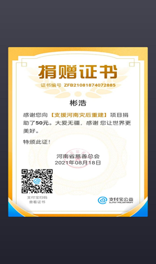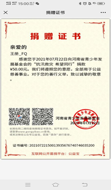 365在线体育投注官网员工第一党支部纺织193董靳磊参与了抗洪志愿者服务,帮助从洪水中转移出来的人员,发放救灾物资。365在线体育投注官网员工第一党支部纺织191郭彬浩,纺织192郝珊珊参与河南暴雨救灾捐助活动进行捐款,积极响应“一方有难,八方志愿”的号召。