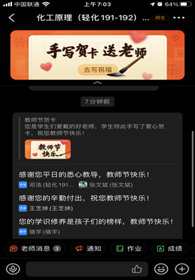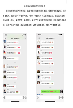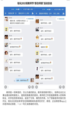 此次活动由各团支书组织各班员工向恪守岗位的老师们送去线上祝福,向老师表达感恩和敬意,收到祝福后老师们也向我们表示了感谢,希望我们学习进步,学业有成。此外,部分员工还通过以班级为单位发送电子贺卡的形式给教师送去最真挚的祝福。
