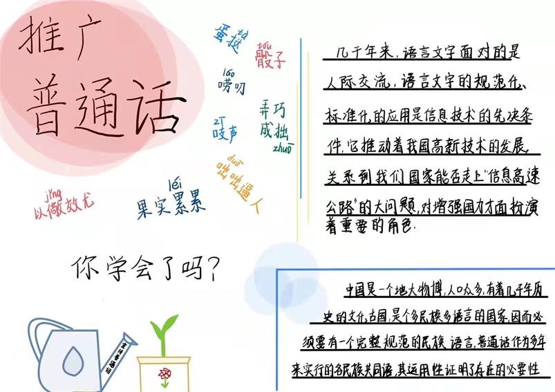 活动开始后得到了同学们的大力支持,生动可爱的手抄报,赏心悦目的规范字和坚持不懈的打卡,在活动末尾的优秀作品展示中更是得到551次浏览的好成绩,成功为推广普通话,为增进各民族各地区的交流和维护国家统一,增强中华民族凝聚力贡献自己宝贵的一份力量。