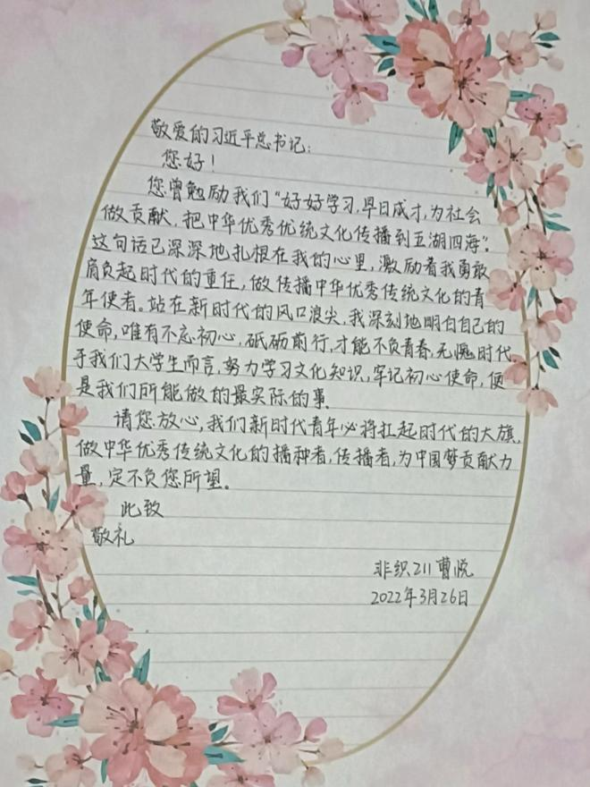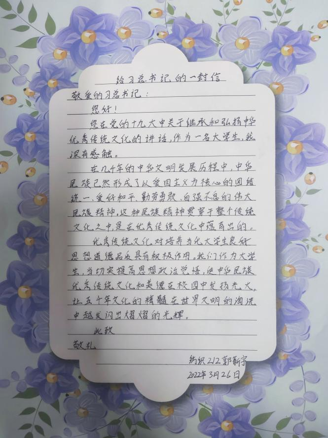 为深入学习贯彻落实习近平总书记关于青年工作的重要思想,发挥好广大青年全面建设社会主义现代化国家新征程的作用。365在线体育投注官网开展《习近平与老员工朋友们》学习活动,于2022年3月25日至28日围绕“习总书记勉励我们‘把中华优秀传统文化传播到五湖四海’”专题,通过“读书交流”、“书信寄语”、“视频感悟”多种形式,引导同学们从学习中收获感悟、汲取力量,坚定文化自信,把中华优秀传统文化传播到五湖四海。