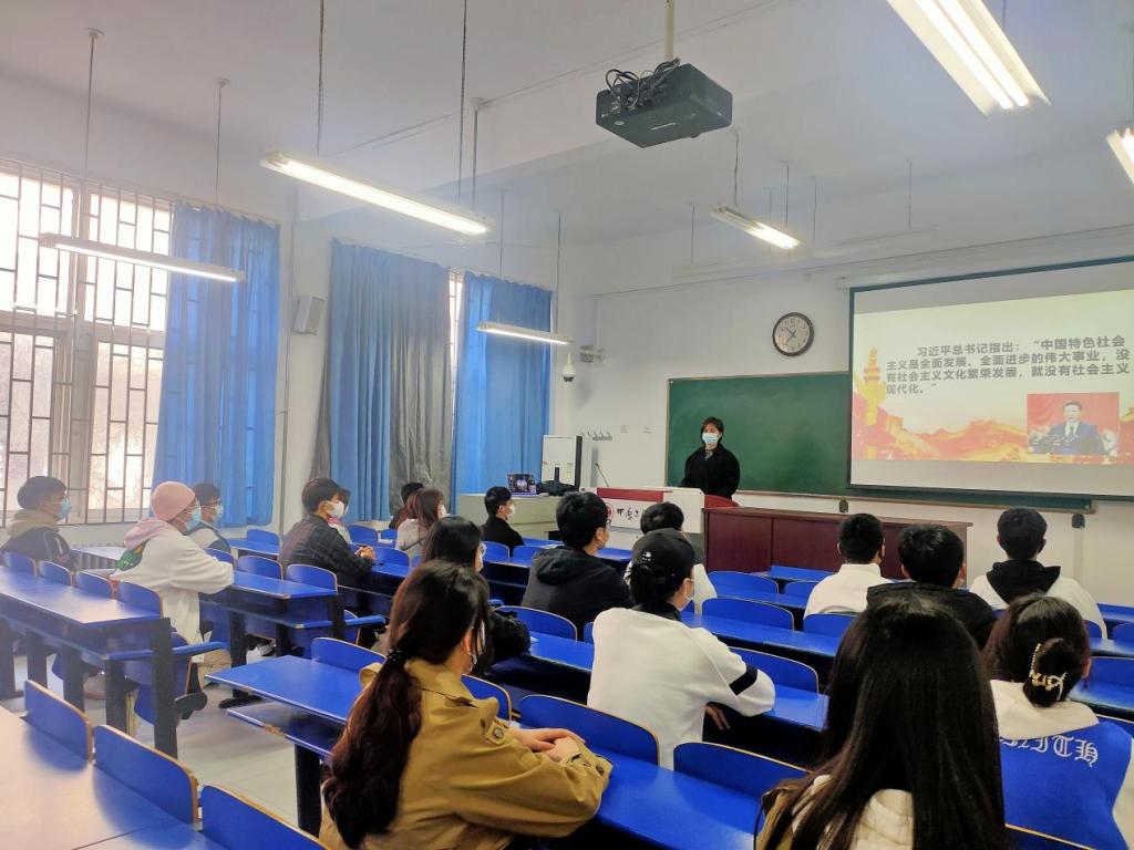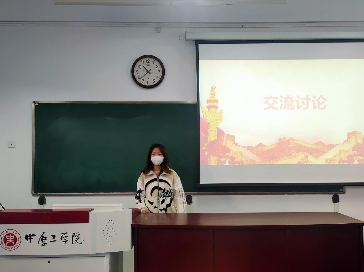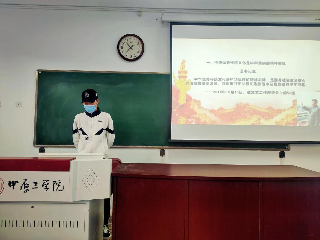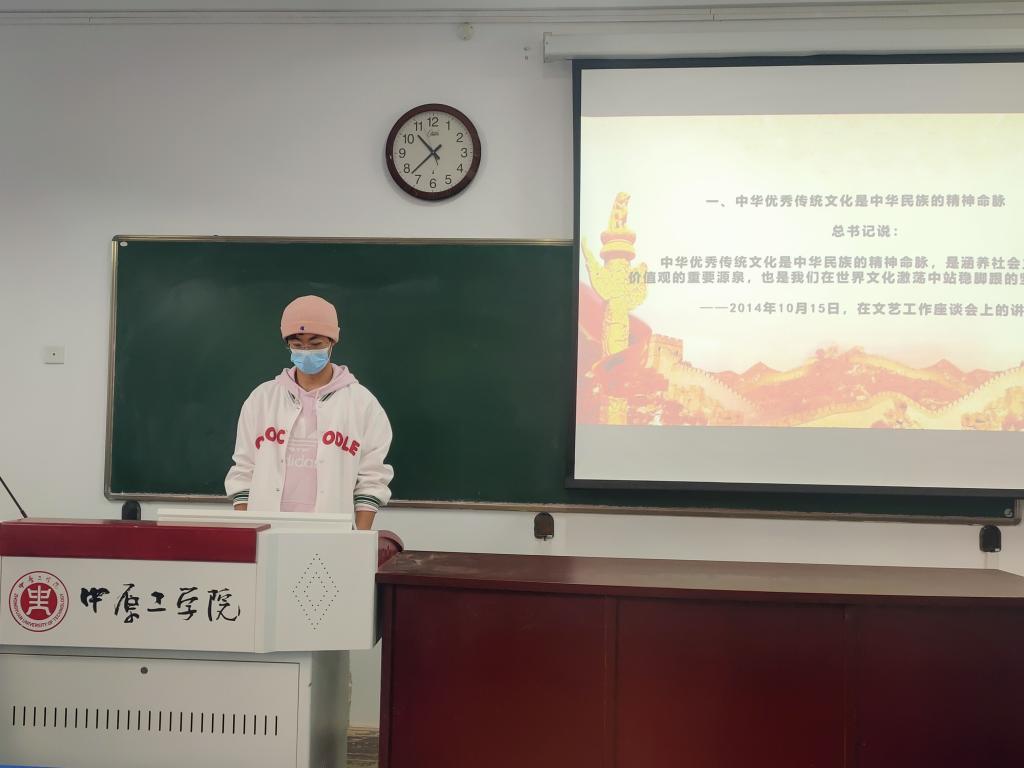 会上,365在线体育投注官网团委副书记张丹丹老师带领同学们重温该章节重点内容,结合学习贯彻党的十九届五中全会精神,弘扬核心价值,坚定文化自信,强调同学们要不断领悟植根于实践的中华优秀传统文化思想精髓,深入挖掘温润而隽永的中华优秀传统文化人文精神要旨,在日常学习生活中不断感知、认可、践行中华优秀传统文化。